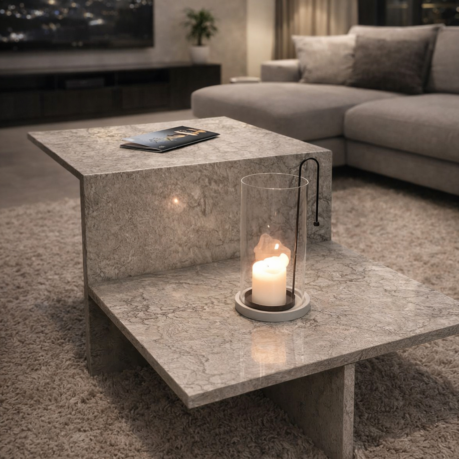 Ett modernt stenbord med skulptural form och naturlig stenstruktur. Designen ger både karaktär och funktion, perfekt för ett stilrent och exklusivt vardagsrum. Varje bord är unikt tack vare stenens naturliga ådring.
